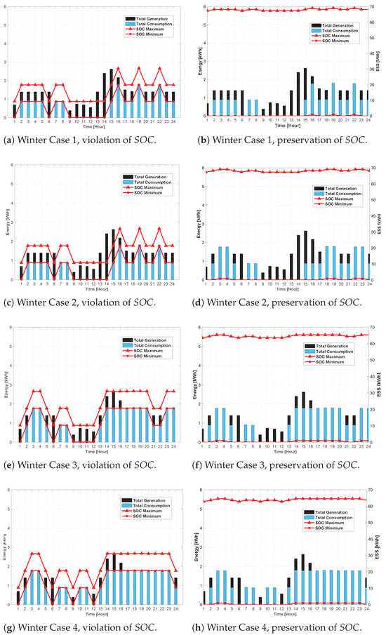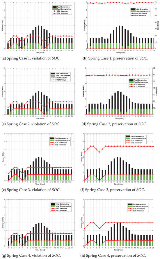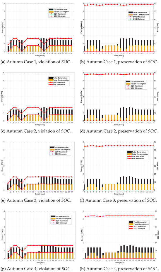 After the spring and summer seasons, with and without the application of safety conditions, the safety conditions are applied to autumn season power generation and consumption data for all cases. From Figure 11a,c,e,g, it was observed that the limitations of ESS were violated without the application of safety conditions. However, after implementing the proposed safety conditions, as illustrated in Figure 11b,d,f,h, the supplying and consuming energies are kept within SOC bounds. The safety conditions were first evaluated for the spring, summer, and autumn seasons, both with and without their application.