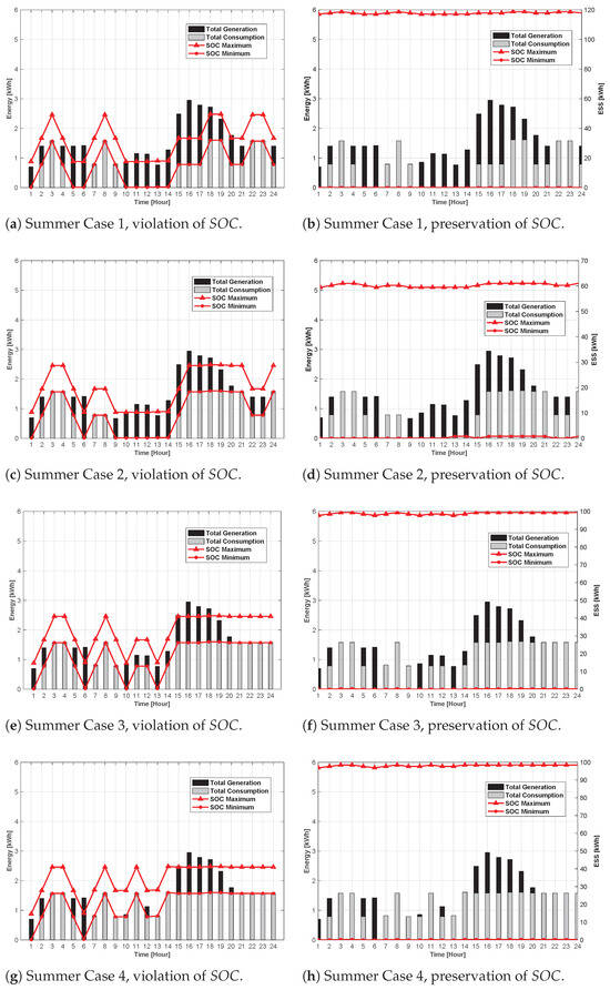 Next, the safety conditions are applied to summer season power generation and consumption data for all cases. From Figure 10a,c,e,g, it is noticed that the capacity limitations are violated. After the application of proposed safety conditions, as shown in Figure 10b,d,f,h, it is verified that SOC maximum and minimum bounds shown in red are kept even in a fluctuating environment.