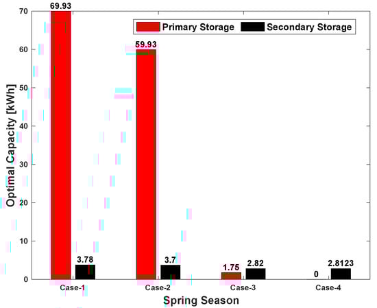 Figure 13 shows the optimal capacity for the spring season considering all cases (i.e., Case 1, Case 2, Case 3, and Case 4). In application scenario Case 1, the primary storage system requires the most significant capacity of 69.93 kWh because it supplies power to both loads (i.e., AC and VF) in conjunction with the secondary storage system with an optimal size of 3.78 kWh. In Case 2, the optimal capacity of the primary storage decreases slightly as 59.93 kWh and secondary storage to 3.7 kWh due to the direct connection between the power generator and one of the loads, reducing reliance on ESS. Case 3 analyzes the optimal storage capacities for primary and secondary storage systems as 1.75 kWh and 2.82 kWh, respectively. In Case 4, as additional direct connections are established, the optimal storage capacity for primary and secondary storage devices is significantly reduced to 0 kWh and 2.8123 kWh, respectively. These connections allow generators to meet power demands directly, minimizing the need for ESS. In summary, in Case 4, the primary storage capacity is reduced to the minimum necessary level. In this case, a single ESS can manage power generation and demand fluctuations.
