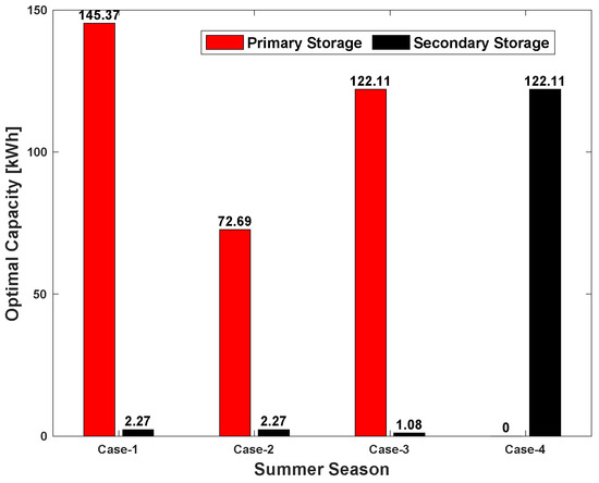 Figure 14 shows the optimal ESS capacity for the summer season considering all cases. In Case 1, the optimal capacity of the primary storage system is the highest at 145.37 kWh, and the secondary storage capacity is analyzed as 2.27 kWh, as power is routed to both loads exclusively through the storage systems. In Case 2, the optimal primary storage capacity decreased slightly to 72.69 kWh for primary storage and 2.27 kWh, and remained the same for secondary storage due to the direct connection between the power generator and one of the loads. In Case 3, primary storage is recorded as 122.11 kWh and 1.08 kWh for secondary storage. In Case 4, a significant reduction in optimal storage capacity is observed because increased connections allow power to be supplied directly from generators to loads, bypassing the storage systems. In this case, primary and secondary storage systems are 0 kWh and 122.11 kWh, respectively. For Case 4, the primary storage capacity is minimized. A single storage system can effectively manage the fluctuating generation and demand in this configuration.