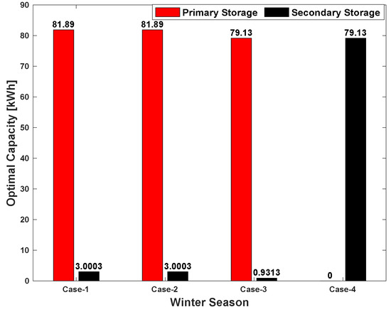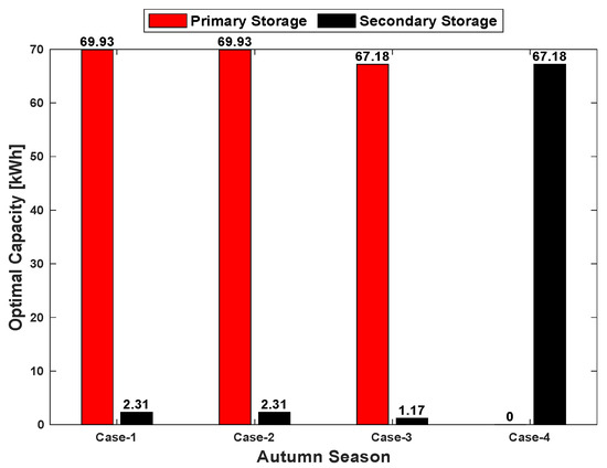 Figure 15 shows the optimal capacity for the winter season as 81.89 kWh for primary ESS and 3.0003 kWh for secondary ESS for Case 1, precisely the exact sizes as both ESSs for Case 2, namely 79.13 kWh for primary ESS and 0.9313 kWh for secondary ESS for Case 3, 0 kWh for primary ESS and 79.13 kWh for secondary ESS for Case 4. Figure 16 shows the optimal capacity for the autumn season as 69.93 kWh for primary ESS and 2.31 kWh for secondary ESS for Case 1, precisely the exact sizes as both ESSs for Case 2, namely 67.18 kWh for primary ESS and 1.17 kWh for secondary ESS for Case 3, 0 kWh for primary ESS and 67.18 kWh for secondary ESS for Case 4. Both seasons show a slight decrease in the optimal capacity of ESSs from Case 1 to Case 4. This indicates the availability of connections between power devices and ESSs.