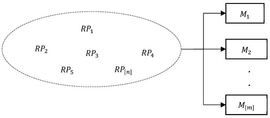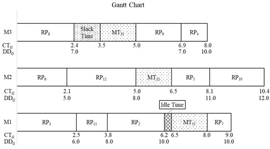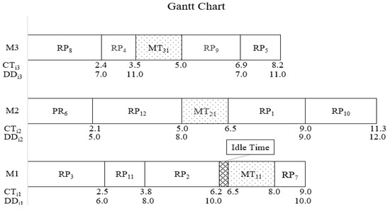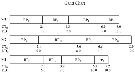 - Find the returned product with the maximum average reprocessing time returned product () among the returned products already assigned in sequences of unrelated parallel machines and then remove from the timetable of the unrelated machines. Shift the returned products following to the left and then go to step 2.