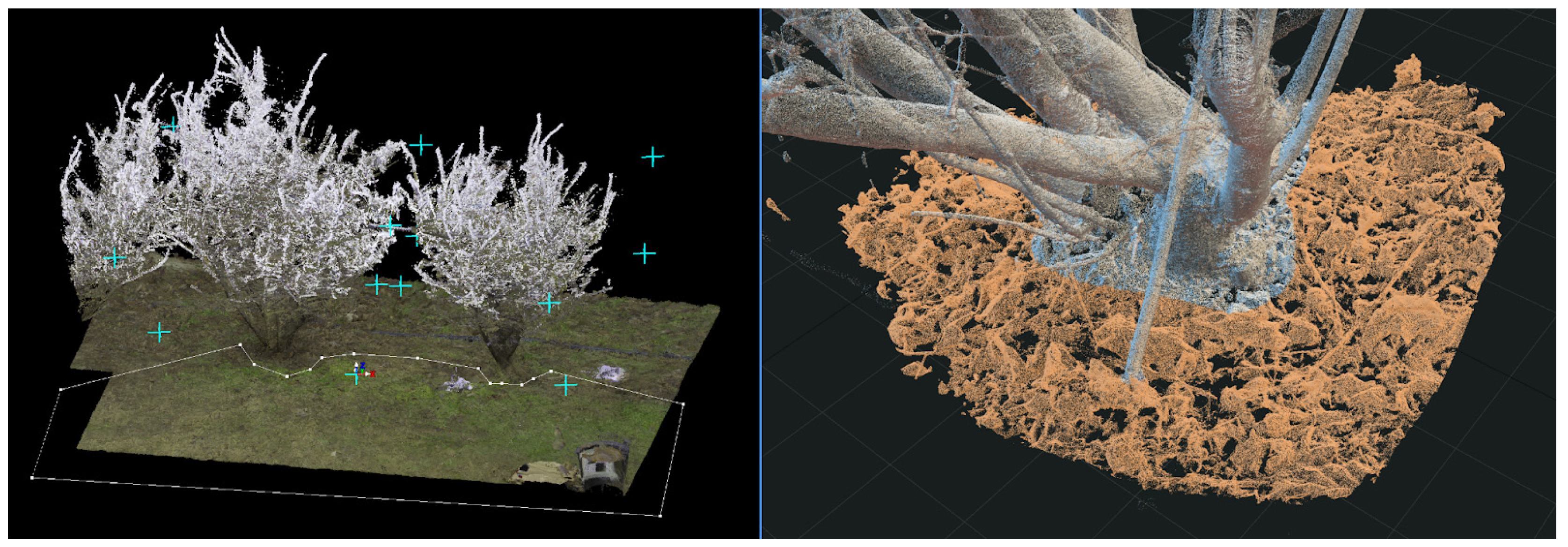 Figure 5), and finally they were used as a basis for the georeferencing of the photogrammetric model. The latter saw the alignment of 200,000 points for each set, and the final dense cloud counted around 30 million for a 5 million polygon mesh model. The dense cloud was first automatically cleaned with a color filter to erase movement noise, after which the imperfections were manually cleaned, and two versions were extracted from the most accurate model among those of the various sets: a complete digital twin (to be used later as a reference) and a clean model of trunks only (for subsequent parameterization).