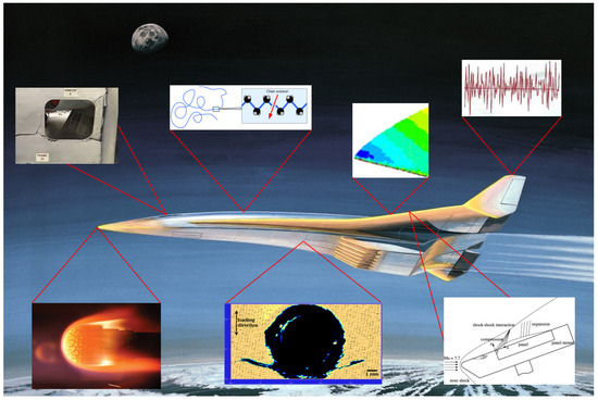 Example parameters to be measure during hypersonic flight (clockwise from top left): fatigue, radiation exposure, pressure loads, vibration, fluid–thermal–structural interactions, acoustic emissions, thermal effects (temperature and ablations, etc.) (Creative Commons).