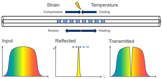 These measurands typically include strain (), change in temperature (), and pressure data; however, with suitable transduction mechanisms, a wide variety of other parameters can be measured. The sensing principle is illustrated in Figure 3.