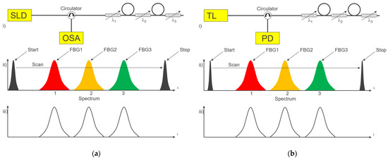 Multiplexing FBGs to achieve DOFSS: (a) using spectral receiver detection; (b) using spectral source detection.