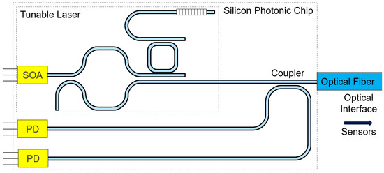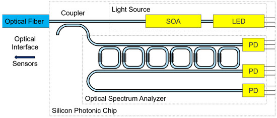 PICs have been effectively utilized in FBG interrogation systems, with numerous studies demonstrating significant advancements in integrating both light sources and detectors onto a single chip. Recent work in silicon photonics has shown that leveraging CMOS-compatible fabrication techniques allows researchers to embed not only passive optical components but also active ones—such as tunable lasers and photodetectors—within a compact photonic platform [112,113].