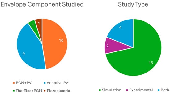 In total, 16 out of 21 papers conducted only simulations in refs. [29,30,31,32,34,35,36,37,38,41,42,45,46,47,48,49], 2 out of 21 conducted only experimental work [34,37], and 3 out of 21 did both experimental and simulations [33,39,44]. Figure 2 (right) shows the distribution of methods of the studies for all 21 papers. Researchers in ref. [29] used EnergyPlus simulations for the energy performance of the dvPVBE to calculate the heating and cooling loads, energy generation, and daylighting performance. Only the PGP and ESP control strategies were employed and the NDP strategy was left for future studies due to its dependency on occupancy which was not included in this study. Researchers in ref. [35] used EnergyPlus simulations to assess the energy efficiency of a prototype building under three combinations of dynamic shading configurations. The AETs are controlled via an Energy Management System (EMS) that provides high-level supervisory controls that are like those used in real buildings. The control strategy was set to maximize annual energy savings by adjusting the AET’s positioning for the dynamic roof and overhangs. Researchers in ref. [37] used the TRNSYS tool and numerical simulations to assess the three Es, energy, exergy, and economic impacts of the envelope system.