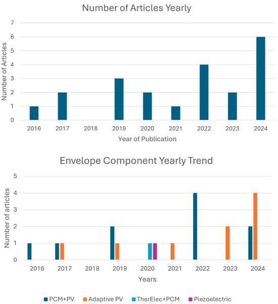About 47% of the papers mention PCM in their study [32,37,38,39,40,43,45,46,48,49]. The topic of dynamic façades has slowly gained traction in the last few years, specifically in regard to dynamic facades with integrated RES (Figure 3). Adaptive PV has been the most widely used dynamic envelope system in recent years.