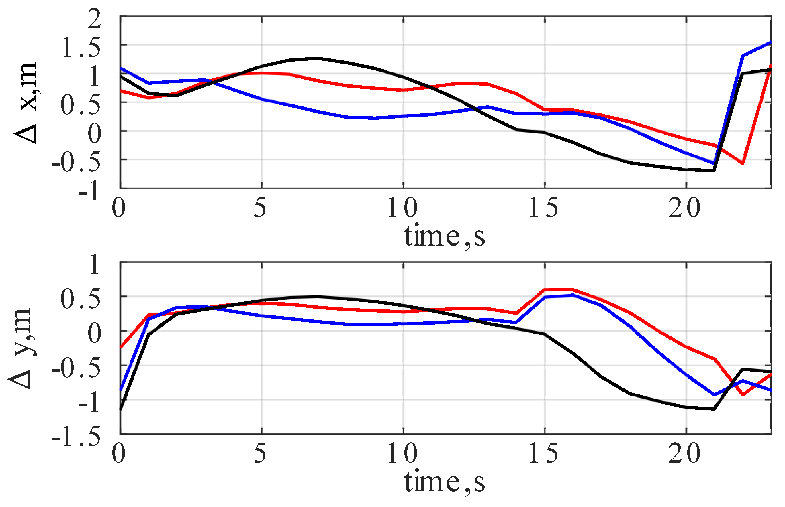 Figure 9. Positioning error along the x and y axes ( Δ x and Δ y , respectively) during the first test of the second experiment. Line colors correspond to different attempts to run the test route.