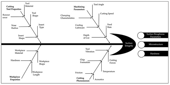Industrial requirements necessitate achieving a high-precision surface roughness accuracy class, which can be achieved by analyzing surface integrity. The term surface integrity was coined by Michael Field and John F. Kahles in 1964 and has since received growing attention in manufacturing [3]. It refers to the modified condition of the surface resulting from machining or other surface-generating processes. It is evaluated based on surface roughness parameters, like mechanical strength and metallurgical, chemical, and topological characteristics [4]. These conditions are examined through hardness variation, residual stress, surface roughness, structural alteration, and corrosion resistance. W. F. Sales et al. [5] found that surface integrity in machining hardened steels is crucial for maintaining fatigue strength and reducing manufacturing costs. However, high temperatures and tool wear can cause surface defects and tool wear. Various factors can affect surface integrity, as represented in the Ishikawa diagram or a Fishbone diagram (Figure 1). The Fishbone diagram of factors influencing surface integrity is highlighted by many researchers [6,7,8,9]. These factors affect the surface integrity and the results that constitute the surface integrity.