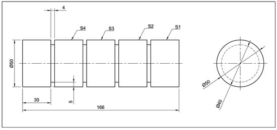 The figure represents a drawing of the workpiece having a diameter of 50 mm. The workpiece had been split into five identical surfaces, each 30 mm in length, with a 4 mm gap groove parting the surfaces with a depth of 5 mm. The surfaces were named S1, S2, S3, and S4. The last part was clamped in the chuck, as shown in Figure 2.