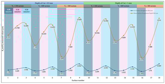 The AA surface roughness value is visualized in Table 5 and Figure 4. The AA surface roughness is marked with the blue line in Figure 4, which shows the surface roughness variation for all 18 surfaces with different cutting parameters. The dark blue stripes represent an f of 0.08 mm/rev, and the light pink stripes represent an f of 0.16 mm/rev. Lightsky-blue color represents an f of 0.24 mm/rev. The orange line marks the mean surface roughness depth. Figure 4 represents the cutting parameters, with a highlighted cut depth of 0.5 mm and 1 mm on top. The vc is mentioned for each ap with 150 m/min, 200 m/min, and 300 m/min, and each vc is divided into three parts of f. Figure 4 provides a comprehensive overview of cutting parameters and results of surface roughness parameters, which makes it easy to understand the cutting parameters and how they can influence the surface quality parameters, Ra and Rz.