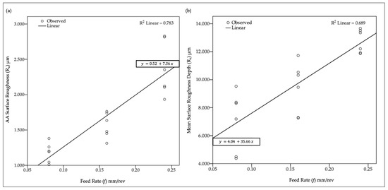 The regression model acceptability was ensured using ANOVA, and the first-order regression model is developed between f and Ra, shown in Figure 5a, and is given by Equation (3).