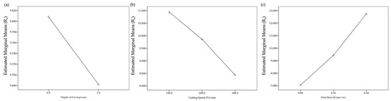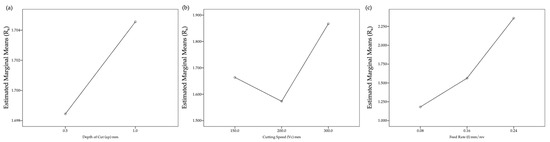 EMM plots of Ra, (a) Depth of cut (ap), (b) Cutting speed (vc), (c) Feed rate (f).
