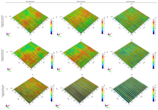 The 3D surface topography obtained through confocal microscopy is represented in Figure 8. A 4 mm × 4 mm area was measured in the X and Y axes, representing the plot (Figure 8). The z-axis is in micrometers (µm), representing depth at different points. The color gradients in Figure 8 represent the depth, green and blue areas indicate lower depth or smoother regions, and red areas indicate the peak or rough regions. These variations show the topographical features of the turned surface.