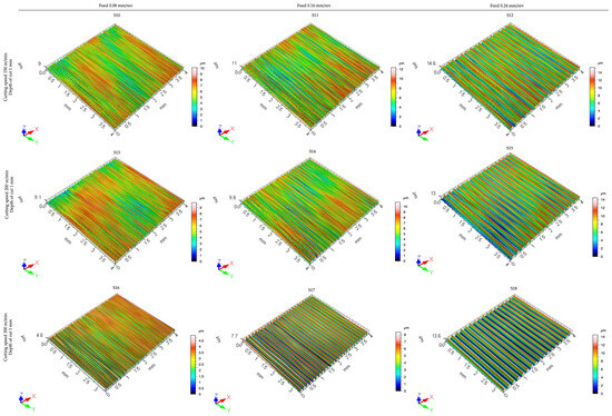 The ap value was 0.5 mm from S1 to S9. S1, with low vc and low f, showing a smoother surface due to minimum material removal per pass, and peaks are less prominent, which is ideal for higher-precision applications. S2, with low vc and medium f, is slightly rougher, as the tool removes more material, and feed marks are more visible due to the higher f. S3, with a low vc and high f, shows a rough surface with visible feed marks, and a high f increases the cutting forces, leading to a higher peak. Surface S4, machined with medium vc and low f, shows a smoother surface than S1, S2, and S3.