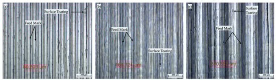 Based on correlation analysis and topography results, three surfaces were selected based on f, cutting phenomenon, and surface profile analysis. Figure 9 represents the optical micrograph of the machined surface numbers 4, 5, and 6 with different fs, 0.5 mm ap, and 200 m/min vc. Figure 9a–c show the results of the spacing of machined surfaces with varying f and feed marks. Figure 9 highlights the surface tearing at several points that represent the defects in the surface. The machined surface’s strip spacing becomes narrower when the f decreases. During low and high f, the surface tearing can be seen at several points in Figure 9a,c. With a lower f of 0.08 mm/rev, the surface tearing is high, and minimal surface tearing can be noticed at a medium f. This analysis was only performed for three experiments with the same vc and the same ap to analyze the variation in f on the surface defect, which is essential to examine the surface integrity of the machined part.