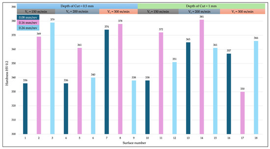 The analysis provides a non-linear relation. Figure 10 represents the hardness variation with cutting parameters. Dark blue bars represent the hardness with an f of 0.08 mm/rev, pink bars represent the hardness with an f of 0.16 mm/rev, and sky-blue bars represent the hardness with an f of 0.24 mm/rev. Each f is divided by vc, and each vc is separated by a different ap, as shown in Figure 10. From Figure 10 and cutting parameters, it can be concluded that at a low vc of 150 m/min, the f increases microhardness for both depths of cut (0.5 mm and 1.0 mm). For a medium vc of 200 m/min, the value of hardness is less consistent, but hardness is increased with an increase in f until 0.16 mm/rev. The effect of high vc on microhardness is more varied and inconsistent. From surface numbers 1, 2, and 3, it can be observed that with the increase in f, hardness also increases, which can be visible in surface numbers 4 and 5, but it drops at moderate vc and high f. It can be concluded that a low vc of 150 m/min with a medium f of 0.16 mm/rev provides better results in terms of hardness.