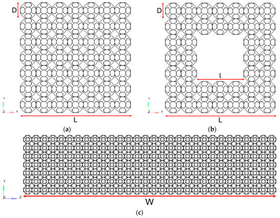 TAOR lattice specimens’ cross-sections: (a) filled square; (b) hollow square. (c) TAOR lattice specimen lateral view.