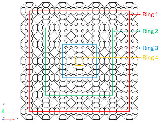 Each ring shown in Figure 3 presents a constant relative density. The relative density decreases from ring 1, the outermost, to ring 4, the innermost. FG specimens present the same mean relative densities as the specimens with uniform relative density and a density gradient of 5%, defined as the difference between the relative density of ring 1 and the relative density of ring 4. The FG specimens with a hollow-square cross-section only contain rings 1 and 2; therefore, the density gradient is calculated between these two rings. The relative density and the density gradient of the FG lattices are reported in Table 3.