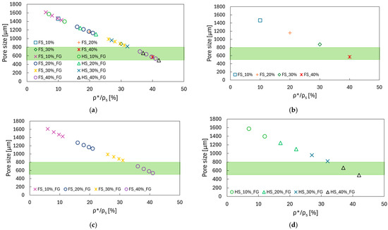 Pore size vs. relative density to determine the TAOR specimens, with the optimal pore size to promote osteointegration shown in the green band: (a) all the configurations; (b) FS; (c) FS_FG; (d) HS_FG.