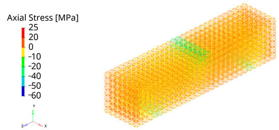 Since the contour plots of the different mesh sizes were very similar in terms of stress distribution, only the results of the specimen with six elements, which is the one selected for the FE analyses, are reported in Figure 6. Indeed, no great influence of the element size on the results was detected during the mesh sensitivity test. Good agreement in the axial stress results under three-point bending was obtained with a coarser mesh with a small percentage difference, below 1%, from the finer mesh. In zone 1, from the comparison between the meshes of two and four elements, percentage differences of 0.58% and 0.55% in tension and compression were obtained. The comparison between the mesh with four and six elements on each strut resulted in a percentage error of 0.57% and 0.56% in tension and compression, respectively. The percentage error decreased to 0.36% and 0.27% in tension and compression from the comparison between the results with six and eight elements on the strut. The good agreement in the axial stress results is confirmed by the comparison of the results in zone 2 with a minimum difference of 0.03% and 0.05% in tension and compression between mesh with six and eight elements on the strut. Therefore, considering the negligible differences in the results, the mesh with six elements on each strut was selected for the FE model. The choice of 1D elements is consistent with the recent literature, where strut-based lattice structures with geometric properties comparable to the TAOR lattice were modelled with 1D elements and the results of the numerical analysis were experimentally validated [28].
