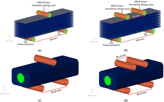 The boundary conditions were applied through cylinders with a 10 mm diameter, simulating the support of a testing machine and placed in contact with the top and bottom plates. The cylinders were modelled in steel and were meshed with first-order 2D quad elements (CQUAD) of 0.6 mm dimensions. The steel was chosen to model the cylinders in order to reproduce the behaviour of the cylinders of a testing machine during experimental tests. The cylinders were positioned for the three- and four-point bending tests, and the boundary conditions were applied on the cylinders through RBE2 rigid elements as displayed in Figure 7a,b. On the top cylinder, a vertical load of 1000 N along the y-axis was applied, while the bottom cylinders were fully constrained. For the four-point bending test, the 1000 N load was divided between the two top cylinders.