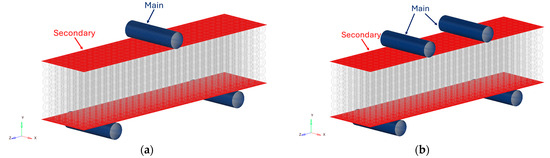 Between the cylinders and the specimen’s plates, a contact with a static Coulomb friction coefficient of 0.4 [29] was modelled, as reported in Figure 8. The cylinders were modelled as the main element while the plates were modelled as the secondary elements. The simulation of the contact requires a non-linear static solver.