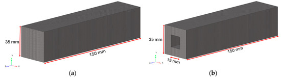 The bulk specimens were modelled with first-order hexahedral elements (CHEXA) of 1 mm. The bulk specimens present the same external dimensions as the lattice specimens, as visible in Figure 9