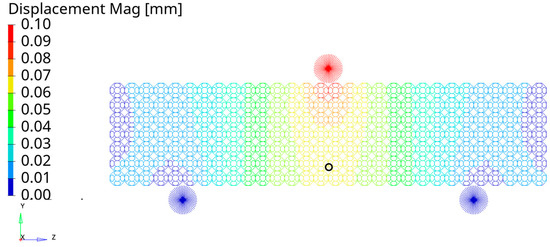 As expected, the three-point bending test results in higher deflections compared to those obtained with the four-point tests. To assess the accuracy of the FE analyses, a comparison between the deflection δ numerically obtained for the bulk specimens and analytically calculated by applying Euler–Bernoulli and Timoshenko beam theories [34] was performed. Timoshenko theory was applied by means of Equations (5) and (6) for the three- and four-point bending tests, respectively, while Euler–Bernoulli theory was applied through Equations (7) and (8) for the three- and four-point bending tests, respectively. The comparison is shown in Table 9.
