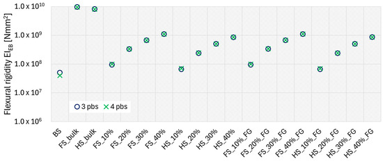 The flexural rigidity EIEB estimated with Euler–Bernoulli beam theory for the three- and four-point bending tests is reported in Figure 11.