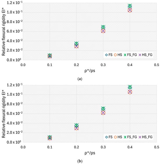 For a better understanding of the results, the relative flexural rigidity EI* is plotted in a graph against the relative density ρ*/ρs as shown in Figure 12a,b for the three- and four-point bending tests, respectively.