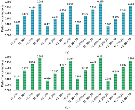 The performance index α [35] with the grade of porosity was calculated by Equation (10) as the ratio between the relative flexural rigidity EI* and the relative density ρ*/ρs.