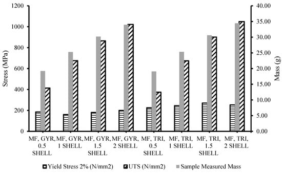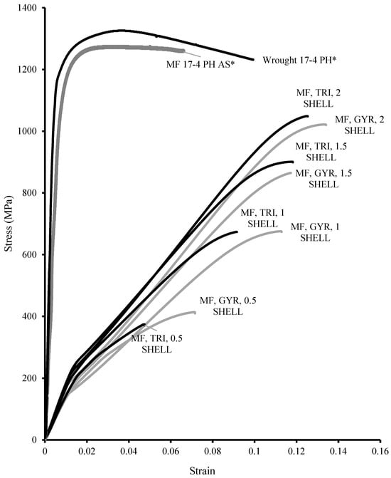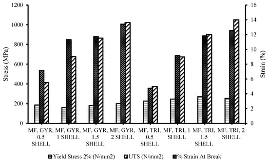 - The specimens showed comparable ultimate tensile strength (1049.1 MPa), matching the claims of the manufacturer (1050 MPa), together with elongation at break, though they were about 4.88% lower in ultimate tensile strength. The specimens showed an increase in ultimate tensile strength when the shell thicknesses of specimens were increased. The two different infill types saw minimal changes, although it should be noted that triangular specimens exhibited greater ultimate tensile strength, whereas the gyroid had slightly longer elongation at break.