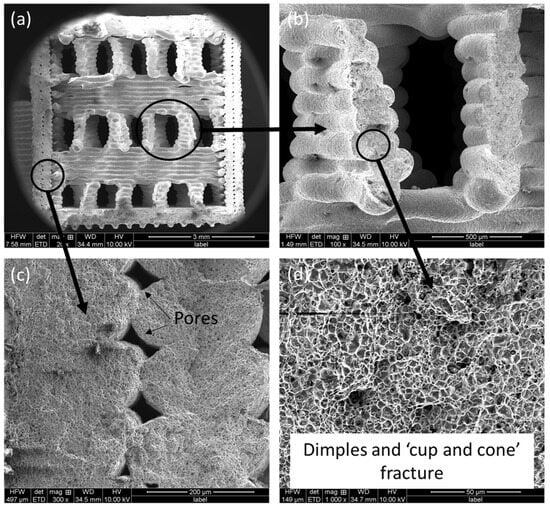 - Microscopic analysis of specimens showed deformities that include striations from tool path error. The cross-section of the tensile tested, broken specimen revealed significant pores in the microstructure and could contribute to a reduction in the mechanical properties of the specimens. Thus, further optimization of the sintering time and temperature was foreseen.