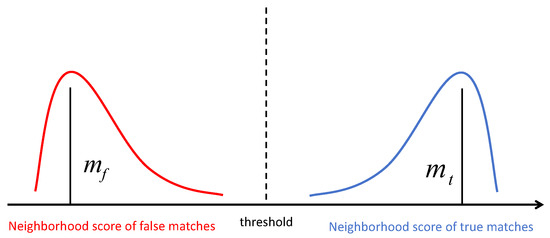 The initial matching results typically include a significant number of incorrect correspondences. To enhance the reliability of the matches, this study applies the GMS algorithm to robustly filter out mismatches. The key idea behind GMS is that correct matches tend to exhibit spatial consistency. In other words, a true match is often located near other keypoints that are also correctly matched, forming locally consistent clusters in the image space. In contrast, false matches are typically isolated, with few or no neighboring correspondences. Based on this assumption, GMS divides the image into grid cells and evaluates each cell by counting the number of matches in its neighborhood regions, effectively distinguishing robust matches from outliers. Figure 3 illustrates the distribution of neighboring matches for correct and incorrect correspondences. Let and denote the mean number of neighboring matches for false and correct correspondences, respectively. The decision threshold for retaining a match in a given grid cell is derived from the statistical characteristics of the neighborhood distributions and is computed as follows: