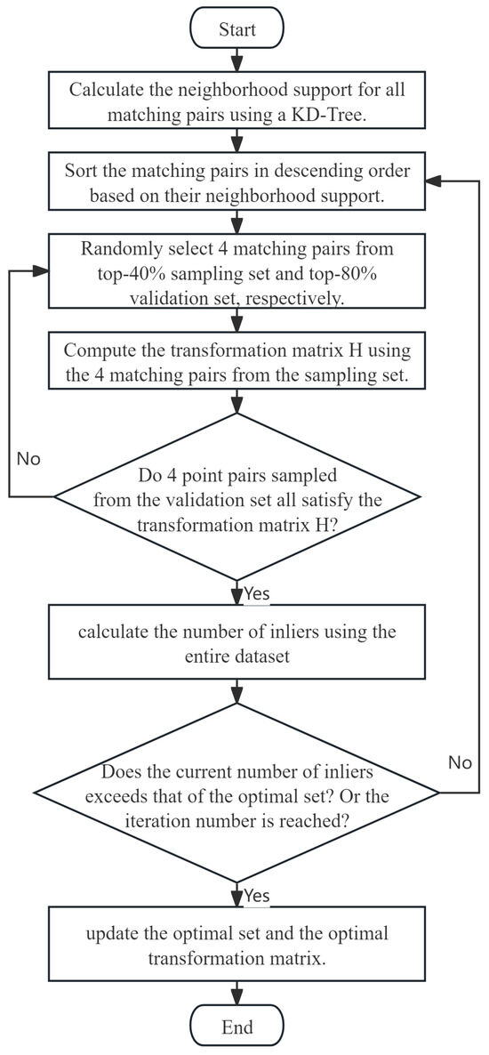 Obtaining neighborhood support involves calculating the distances between a given feature point and all other feature points in the image to determine whether they fall within a specified radius r. This process becomes computationally expensive and time-consuming, particularly when handling a large number of feature points. To improve computational efficiency, this paper employs a KD-Tree data structure [25] for organizing and storing feature points. The KD-Tree enables efficient nearest neighbor queries, substantially reducing both computation time and the overall feature matching duration. The improved RANSAC algorithm is shown in Figure 4.