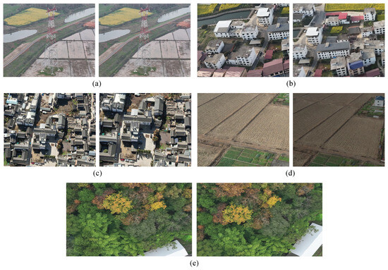 Examples of the self-built dataset. (a) Transmission towers with viewpoint change, (b) houses with image blur, (c) buildings with scale change, (d) farmland with light change, and (e) forests with rotation.