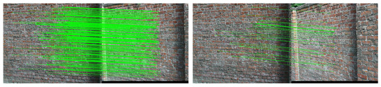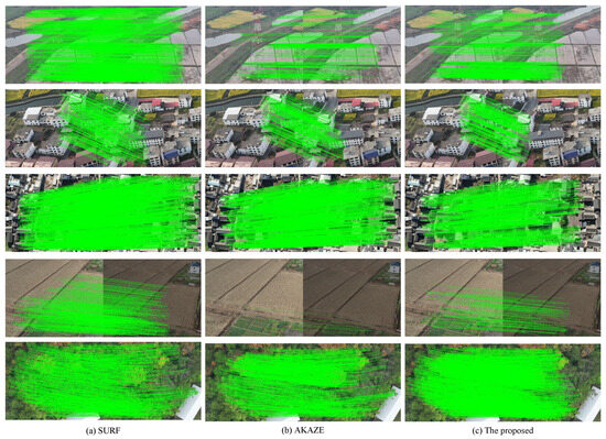 Matching time is a crucial metric for evaluating the real-time performance of the proposed algorithm. As presented in the tables, the proposed method consistently achieves faster matching speeds compared to traditional approaches, significantly outperforming both SIFT and SURF. For instance, in the case of building images with scale change, our proposed approach achieves a matching time of just 972.28 ms—nearly five times faster than both SIFT and SURF (requiring only 19% and 20% of their processing time, respectively). Compared to AKAZE, the proposed method also demonstrates superior efficiency. Specifically, it needs less matching time than AKAZE even when processing twice the number of feature points as reported in Table 3, highlighting its computational efficiency. Recent advancements in deep learning-based image matching, such as SuperPoint [27], SuperGlue [28], and LoFTR [29], have shown remarkable accuracy by designing sophisticated neural network architectures. However, these methods typically require substantial computational resources supported by high-performance GPUs and rely heavily on large-scale, high-quality annotated datasets for effective training. Meanwhile, aerial image matching imposes stringent requirements for real-time performance. The experimental results demonstrate that the proposed algorithm effectively meets practical requirements in both matching accuracy and computational efficiency. Moreover, the algorithm exhibits low computational costs, making it particularly suitable for deployment in UAVs.
