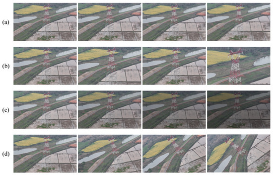 Transmission tower images with (a) image blur, (b) scale change, (c) light change, (d) rotation.