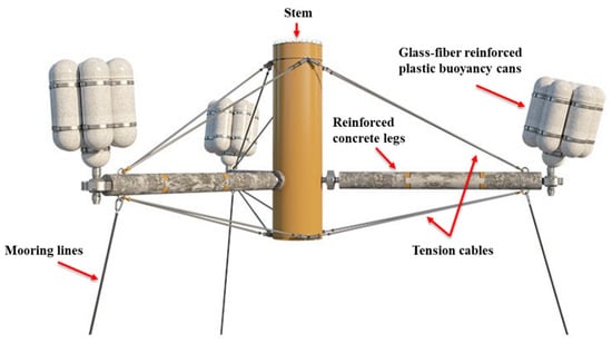 A general representation of the SMA configuration used in this study is detailed in Figure 3. The concrete legs of the substructure are supported by top and bottom cable pairs, providing the required tension to keep the legs under compression under all expected loading levels. The buoyancy unit is rigidly attached to the leg tip. Whereas the depicted buoyancy unit-leg connection is simplified for the OpenFAST model [15], it consists of seven individual glass-fiber-reinforced cans bundled together. Although the can-leg joint is fixed, the leg-stem joint has some flexibility, allowing for small rotations of the legs in the vertical and horizontal planes. The mooring line is attached at one end to the leg tip and a concrete suction anchor at the other end. For this study, a semi-taut mooring configuration is used with the tautness ratio defined in Equation (1) as the ratio of the completely taut distance between the leg tip and anchor point (LT) to the unstretched mooring line length (LM):