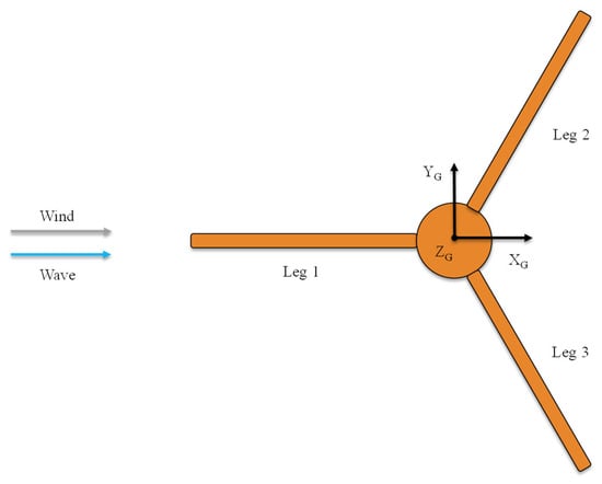 The substructure was optimized for the DLC 6.1a ‘parked’ load case (i.e., 50-yr extreme event wind and waves, with idling turbine) [14], herein referred to as ‘extreme parked case’, with aligned wind and wave directions along the upwind leg (as shown in Figure 2). The DLC 6.1a load case was chosen for this study due to being the design driving case. The right-hand global coordinate system is defined such that the global X-direction aligns with the wind direction and the global Z-direction points upward towards the nacelle, as shown in Figure 2. The origin of the global system is the center of the stem at the still water line (SWL).