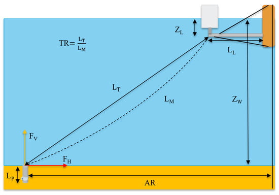 For example, a taut mooring line will have TR = 1 and LT = LM, meaning there is neither slack nor stretching in the line at static equilibrium (ignoring self-weight effects). If at static equilibrium the line is stretched, then TR > 1; if there is slack, then TR < 1. TRs greater than 1 at static equilibrium were avoided in this study, as the introduction of pretension in the mooring system would increase the mooring and anchor loading, and fatigue would be a larger concern, as is the case for TLP mooring and anchoring systems. The anchor radius (AR) is the horizontal projection of the distance vector from the origin of the reference frame to the anchor point. FV and FH are the vertical and horizontal anchor loads from the mooring line tension, and LP is the penetration length of the anchor.