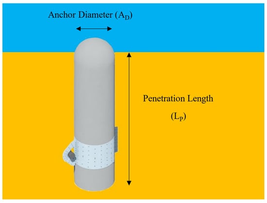 Based on the results of [18], the baseline anchor’s technical specifications, including the anchor dimensions, mass, and vertical and horizontal capacities, were determined. For a given water depth, anchor diameter, soil shear strength, and the horizontal and vertical anchor holding capacities of a baseline anchor were determined. The study found that both the vertical and horizontal anchor holding capacities scale roughly with the square of the anchor diameter (Equation (5)) [18]. Since the cross-section of the anchor is circular, the anchor holding capacity also scales with the square of the anchor mass (Equation (6)).