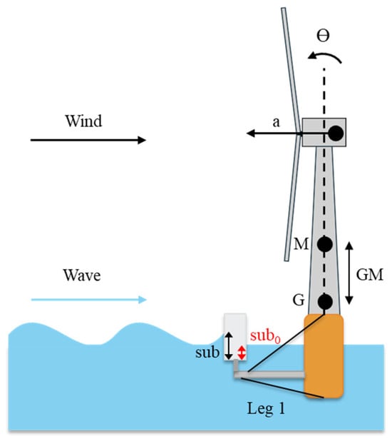 A detailed time-domain analysis framework using OpenFAST and employing the equivalent mass methodology was utilized to evaluate the objectives mentioned at the end of Section 1. Since only the extreme parked case was used in this study, the selected constraints focused primarily on the dynamic stability of the FOWT. The decision variables, along with the respective constraints imposed on them, are shown in Figure 5 and listed in Table 5. The submergence constraint k is defined in detail in Equation (9), which is determined using sub and sub0 as depicted in Figure 5.