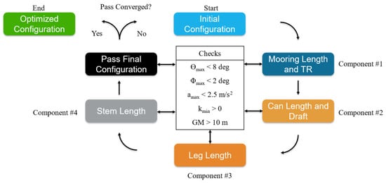 In general, the results indicate that an optimization scheme as shown in Figure 6 is reasonable, but that the can bracing could be added as an additional component and maximum surge added as an additional constraint. Moreover, the component order could be changed to ensure that the components with design variables that have a higher per-meter influence on SMA equivalent mass and the constraints (e.g., as indicted in Table 7) are considered first.
