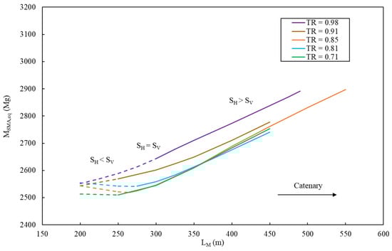 Generally, MSMA,eq increases with LM across all TRs. However, there are two distinct regions with varying degrees of linearity that become more apparent as TR is lowered. For each respective TR in Figure 7, the solid line portions indicate the mooring lengths for which the anchor equivalent mass required to meet the horizontal load capacity of the anchor exceeds that of the vertical load capacity (SH > SV). In contrast, the dashed region indicates the opposite. As the mooring system is drawn tauter in static equilibrium, which represents a higher TR, the mooring system has a higher restoring stiffness. This higher restoring stiffness results in greater anchor loading as TR increases because the substructure surges less and pitches more, resulting in higher mooring line tension. This can be seen in Figure 7 as MSMA,eq generally increases with TR due to the higher anchor mass required to handle the larger anchor loading. Longer lines add more mass and have smaller angles between the mooring line and seabed, resulting in the anchor carrying a larger portion of the load in the horizontal direction compared to shorter lines. This explains the transition of the dashed to the solid regions across all TRs.