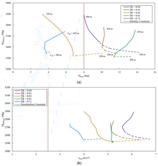 The influence of LM and TR on ϴmax and amax is shown in Figure 8a and Figure 8b, respectively. For a fixed TR (one color of lines), the distinct minimal values for SMA equivalent mass and the optimal LM for minimizing MSMA,eq occurs when SH = SV (where the solid and dashed lines meet). However, in some cases, these optimal mooring line lengths do not coincide with the minimum platform pitch and never coincide with the minimum horizontal RNA acceleration. For instance, longer lines help reduce ϴmax and amax for TR = 0.85, though they result in a much higher MSMA,eq. It is also seen that ϴmax and amax are non-linearly dependent on TR.