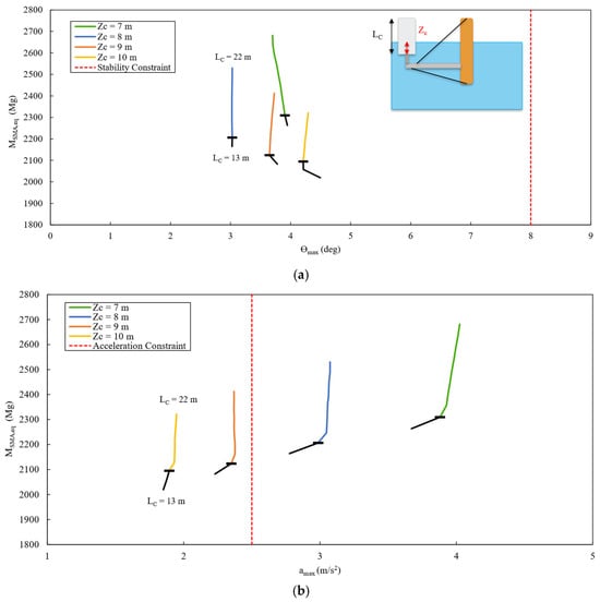 The second component to undergo investigation was the buoyancy unit (or cans, which were optimized in terms of a can bundle) with two design variables: length (LC) and draft (ZC). The influence of LC and ZC on ϴmax and amax is shown in Figure 9a and Figure 9b, respectively. The kmin values for all simulated cases involving the cans in the first pass can be found in Table A1 of Appendix A.